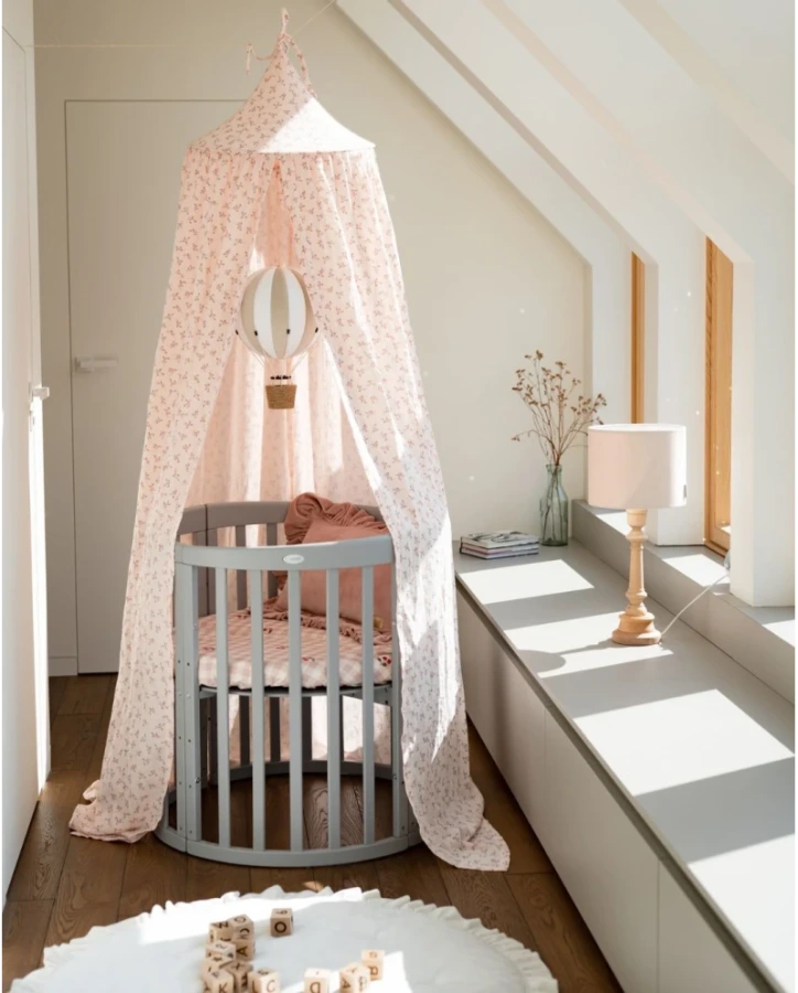 Baldachýn nad detskú postieľku, ktorý vytvára útulné a pokojné prostredie na spánok, chráni dieťa pred svetlom a zároveň dotvára dizajn detskej izby.